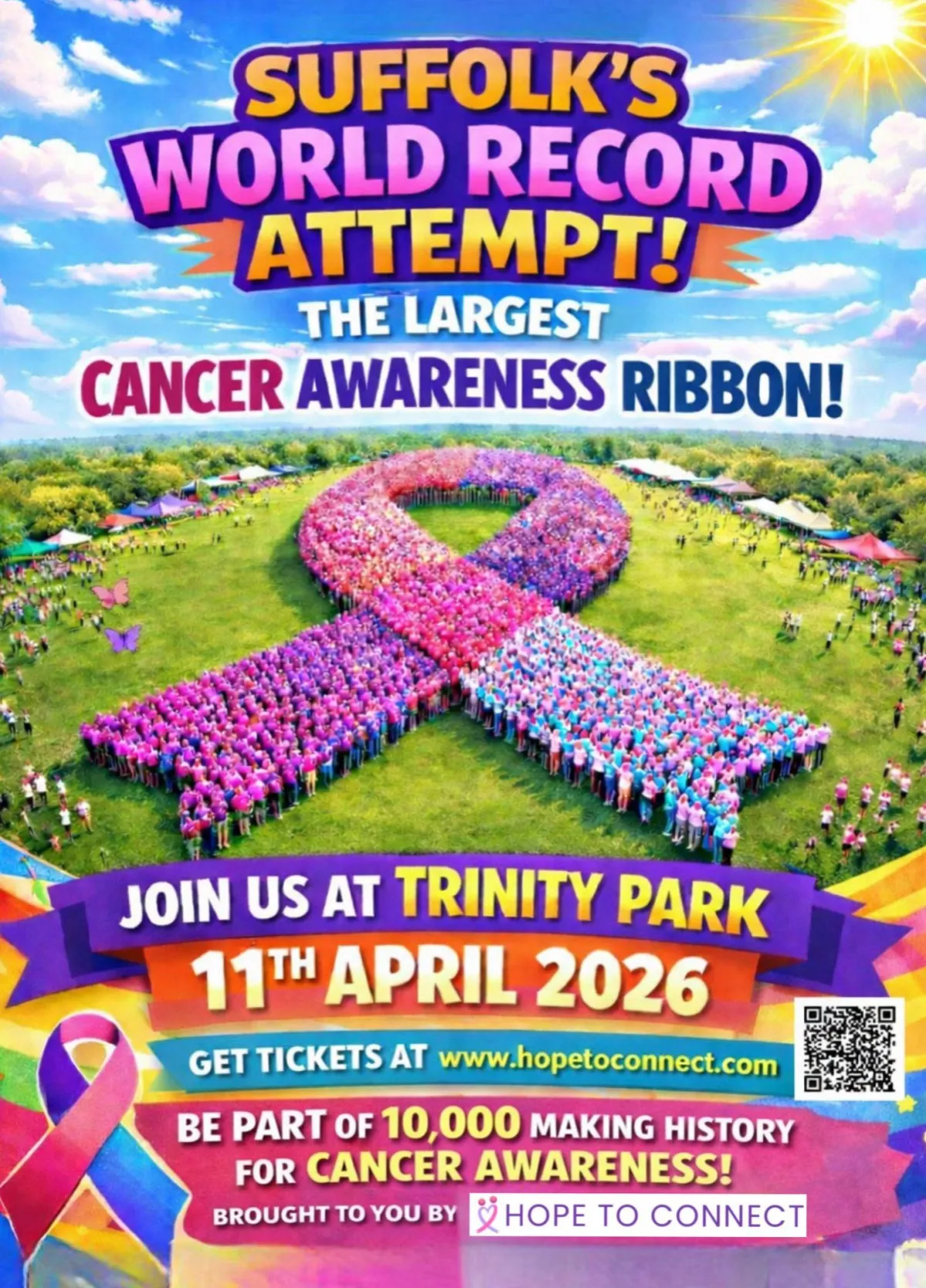 Mark your calendars – Saturday 11th April 2026 – because Suffolk is about to make HISTORY! Together, we’re attempting to break the World Record for the largest Human Cancer Awareness Ribbon… and we need YOU to be part of it!