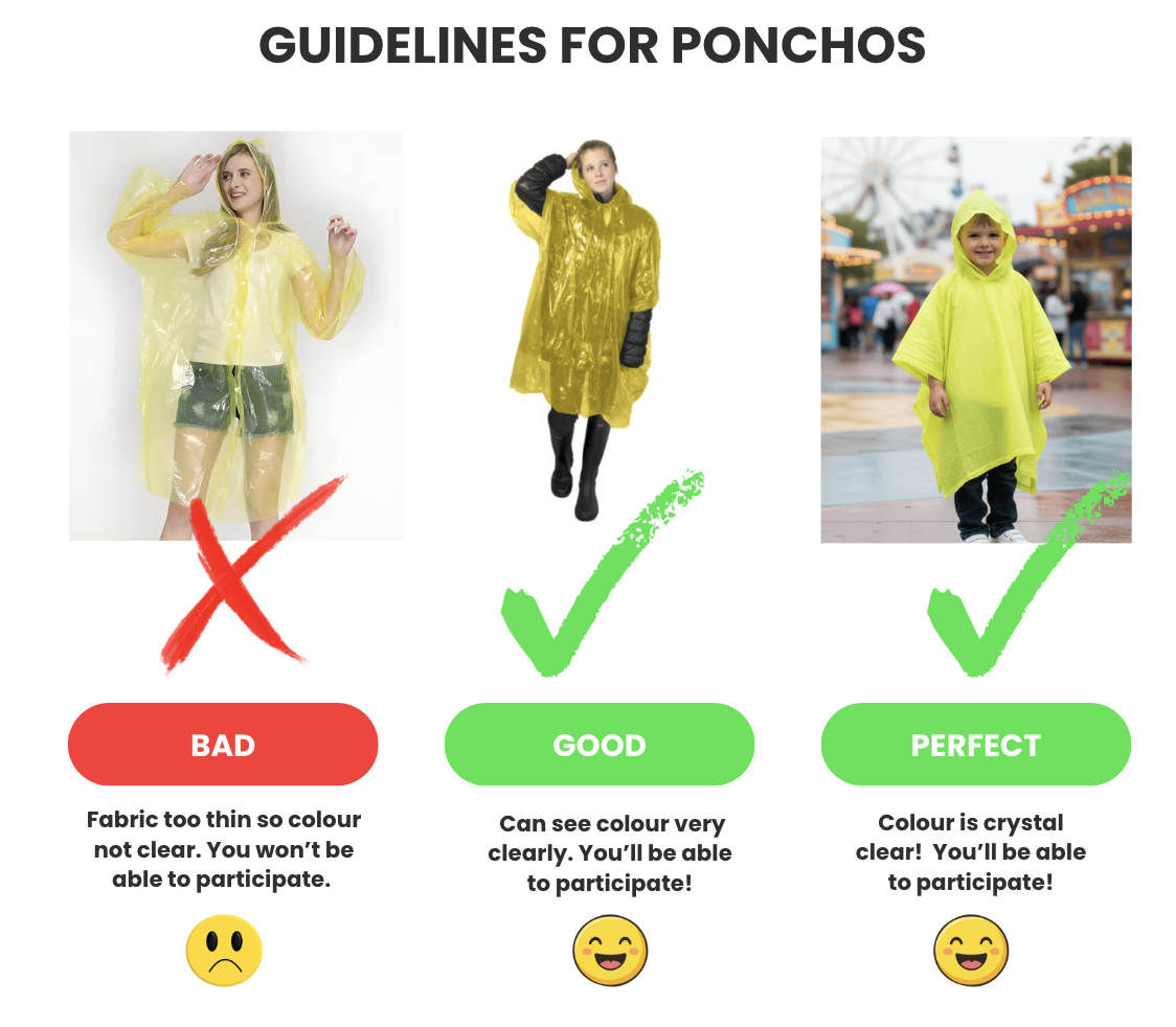Participants must wear a single BRIGHT colour covering their torso and head. This can be a hoodie, a poncho or a cap and t-shirt. For ponchos, here's a guide.