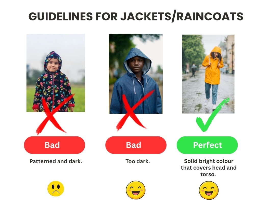 For the official Guinness World Record attempt to be qualified, every participant must wear a bright coloured hoodie, poncho, raincoat with hood, jacket with hood or cap and matching tshirt, so their torso and head are covered.
